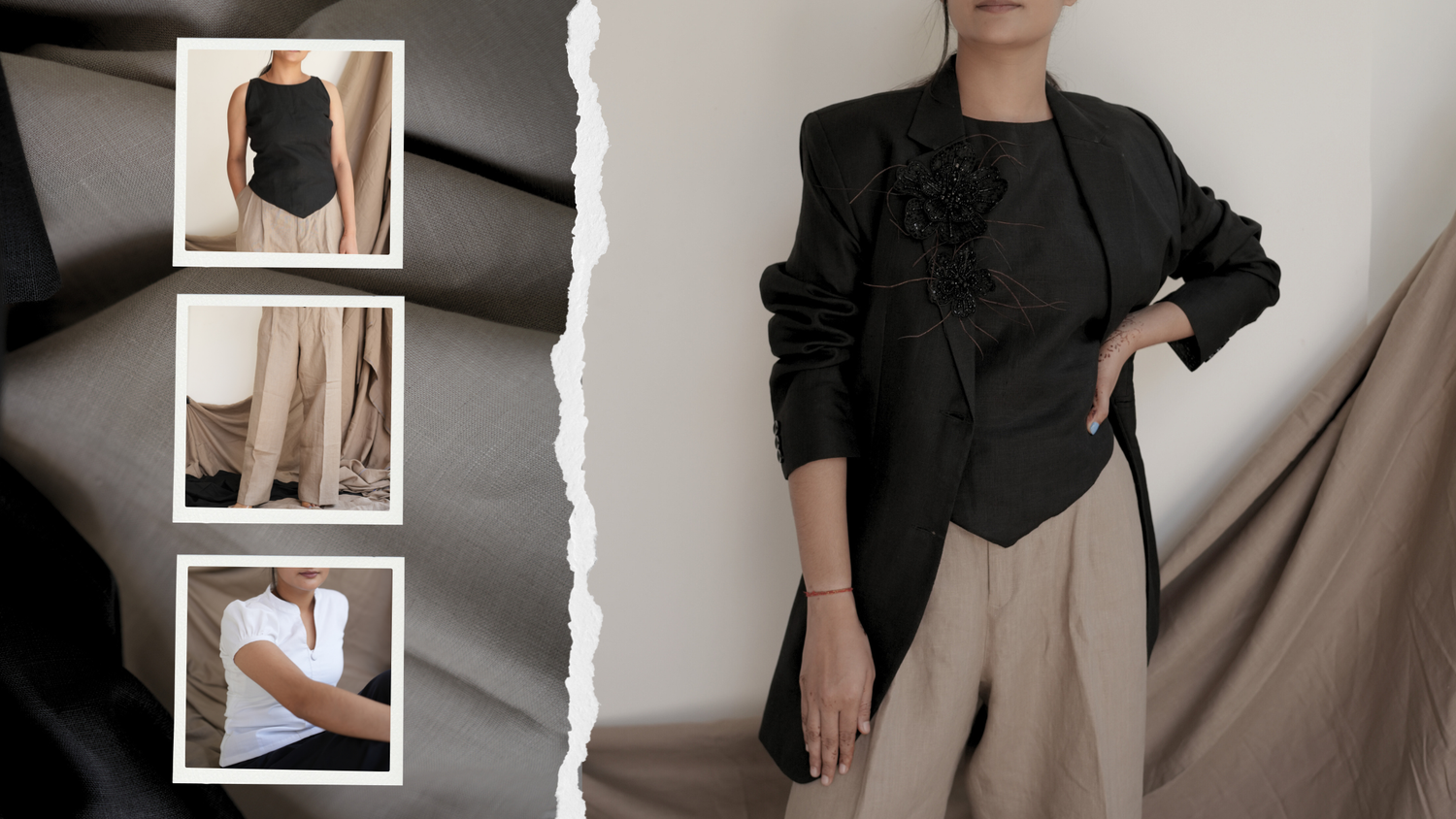 Linen Black Blazer for Women with Hand-Embroidered Floral Design